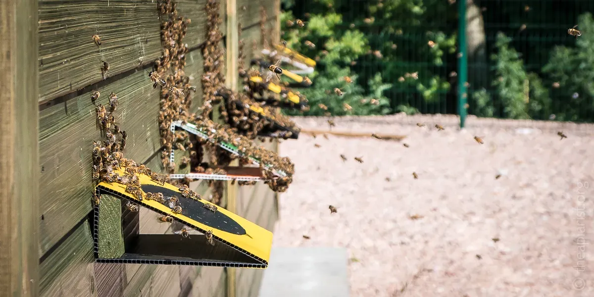 In the same way that bee hives provide shelter for the bees, bee sheds or shelters protect the beekeeper and the hives from the elements. Although often seen in continental Europe they are rarely used in the UK. They provide significant advantages in areas with poor weather or for beekeepers who must visit their hives on particular days – for example, due to commitments during the working week that necessitate all inspections are conducted on the (inevitably) rainy weekends.